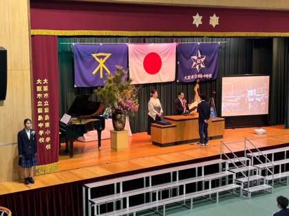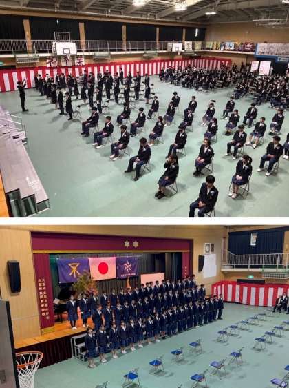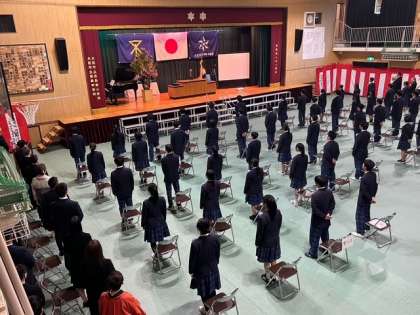 3月14日の金曜日に第76回 卒業式が挙行され、9年生56名が本校を卒業しました。在校生送辞のあとに続く卒業生答辞では、読み上げる2人の代表生徒が感極まってしまうようすに、他の卒業生も思わず涙ぐむ場面がありました。また、卒業生の合唱の前には、3年間を皆で支えあってきた76期生の思い出を語るすばらしいメッセージがあり、保護者や地域の皆さまへの感謝を伝えてくれました。