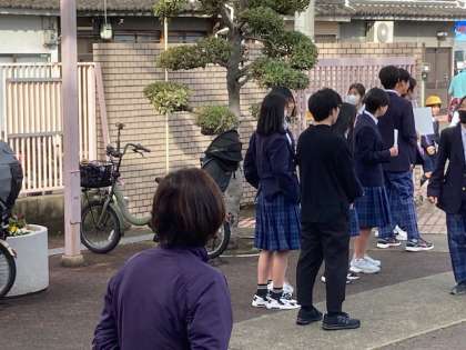 現在、部活動の勧誘が行われており、各部活動の代表者が登校する生徒に声をかけています。
