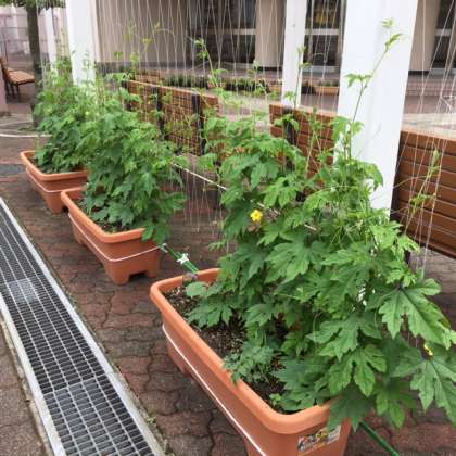 学校の玄関前に管理作業員さんが「ゴーヤ」を植えてくださいました。