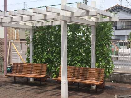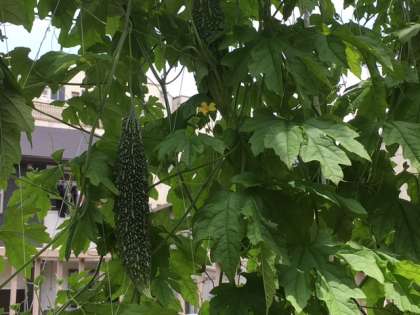 玄関庭のゴーヤが大きくなり、緑がきれいです。