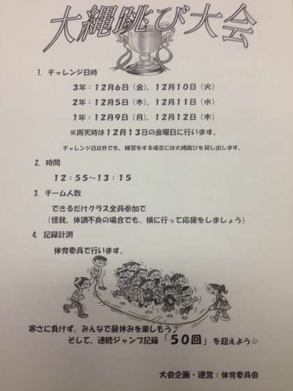 今日の昼休みから「大縄跳び大会」のチャレンジが始まります。