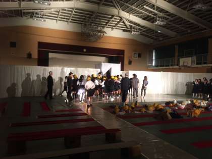 鑑賞後は舞台裏を見学し、小道具の説明を受けたり、動物に扮装させてもらったりしました。