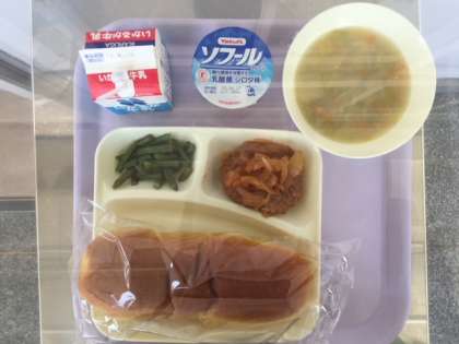 本日のメニューは、煮込みハンバーグ、コーンスープ、三度豆のサラダ、ヨーグルト、牛乳です。