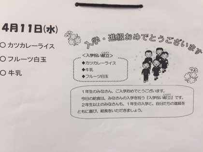 今日の給食は、1年生の入学をお祝いしての献立でした。