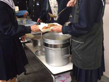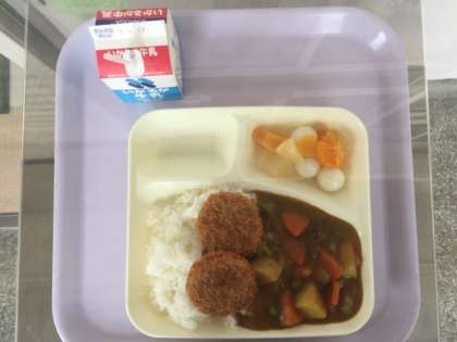 今日のメニューは、カツカレーライス、フルーツ白玉、牛乳でした。