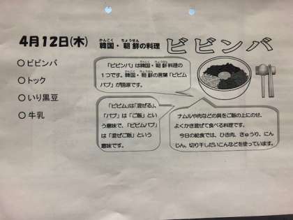本日のメニューは、ビビンパ、トック、いり黒豆、牛乳です。