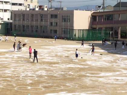 先生方、管理作業員さんとラグビー部、野球部、陸上部、サッカー部のみなさんでにがりまきをしました。