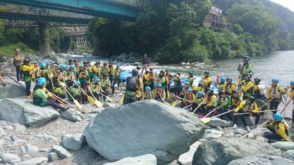 ラフティングの説明を受けています。 みんな真剣に聞いています。