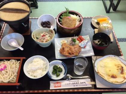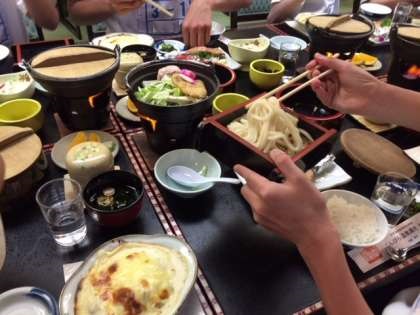 うどんすきや骨つき鶏などご馳走に歓声です。