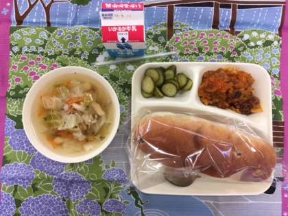 じゃがいものミートグラタン、スープ、きゅうりのピクルス、パン、牛乳