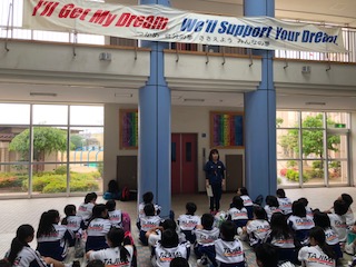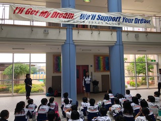 みんな、ワクワクどきどきの今日、玄関棟ピロティで出発式です。