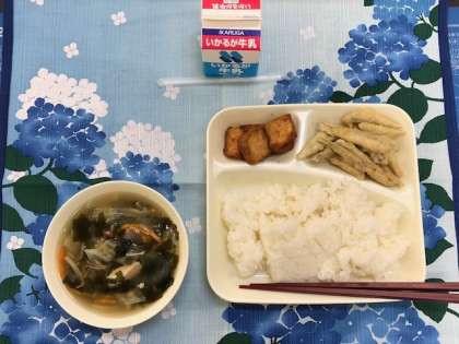 いわしてんぷら、五目汁、あつあげのしょうがじょうゆかけ、米飯、牛乳
