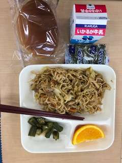 焼きそば、オクラの中華あえ、オレンジ、パン、牛乳
