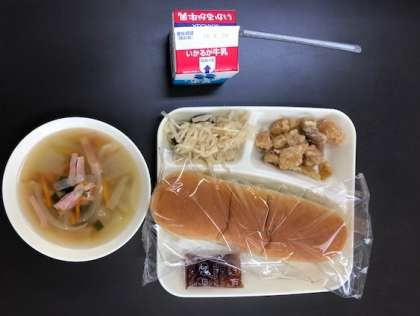 鶏肉のからあげ、とうがんの中華スープ、切り干しだいこんの辛みづけ、パン、ジャム、牛乳
