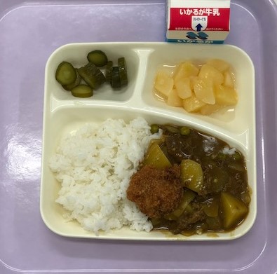 ビーフカレーライス、一口ヒレカツ、きゅうりのピクルス、白桃、米飯、牛乳