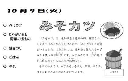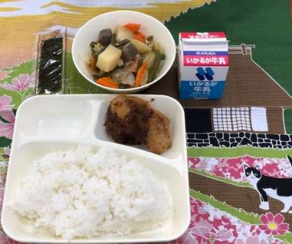 みそカツ、じゃがいもと野菜の煮もの、焼きのり、米飯、牛乳