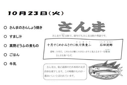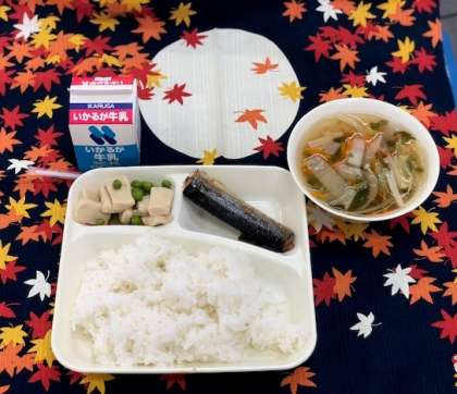 さんまのさんしょう焼き、すまし汁、高野どうふの煮もの、米飯、牛乳おいしくいただきました。