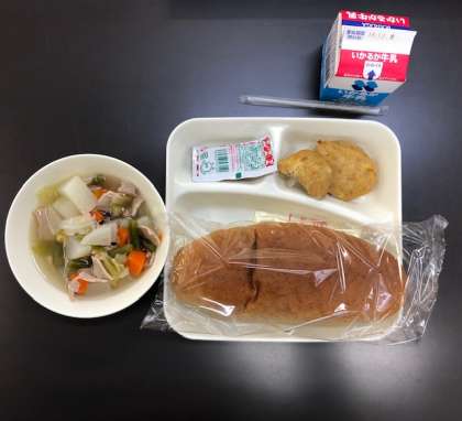 とうふハンバーグ、スープ煮、スライスチーズ、パン、牛乳