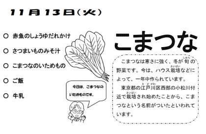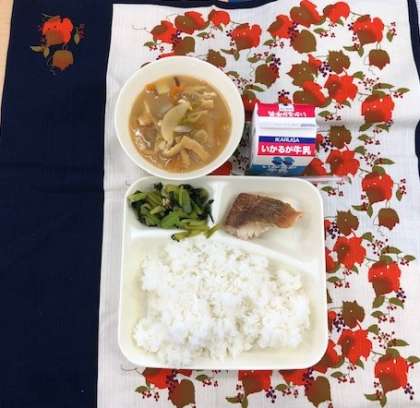 赤魚のしょうゆだれかけ、さつまいものみそ汁、こまつなのいためもの、米飯、牛乳
