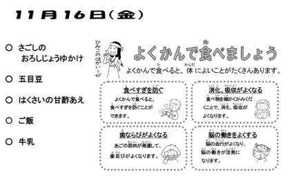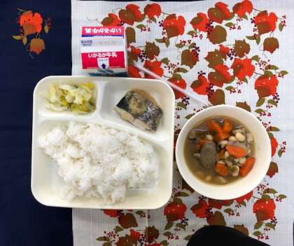 さごしのおろしじょうゆかけ、五目豆、はくさいの甘酢あえ、米飯、牛乳