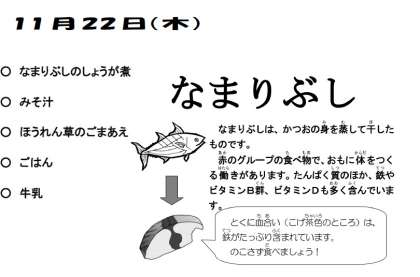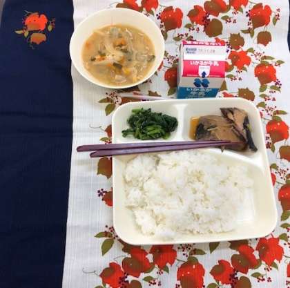 なまりぶしのしょうが煮、みそ汁、ほうれん草のごまあえ、米飯、牛乳