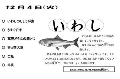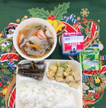 いわしのしょうが煮、うすくず汁、高野どうふの卵とじ、まっ茶大豆、米飯、牛乳