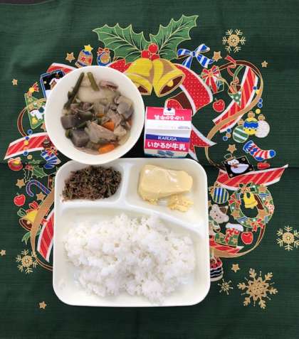 卵どうふ、豚肉とさといもの煮もの、おかかなっ葉、米飯、牛乳