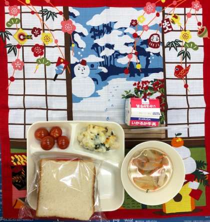 ほたて貝のグラタン、だいこんのスープ、プチトマト、パン、牛乳