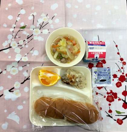 押し麦のグラタン、スープ、デコポン、パン、パン添加物、牛乳