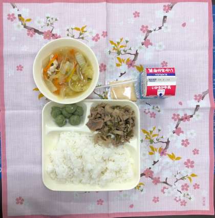 豚肉とれんこんのいため煮、すまし汁、きな粉よもぎだんご、米飯、牛乳