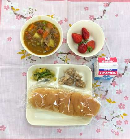 フライドチキン、カレーシチュー、春のカラフルソテー、いちご、パン、牛乳