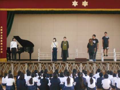 学年の教員が舞台上で、合唱隊形や礼の仕方、タイミングなどの手本を示しました。