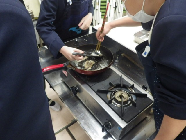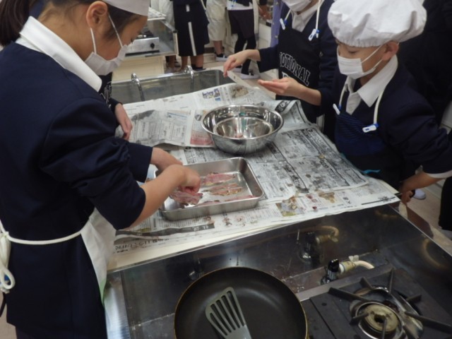 東部市場と大地の会の皆さんに来ていただいて、5年生で出張料理教室を行いました。今回は水産教室ということで、鰯(いわし)の手開きに挑戦して、バター焼きにしました。