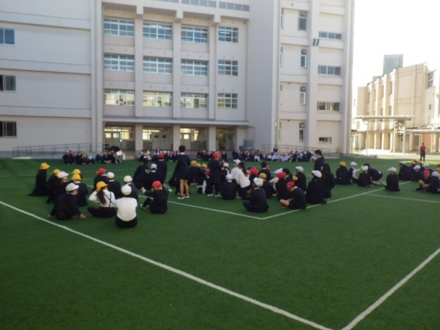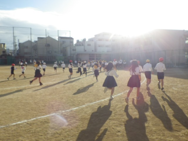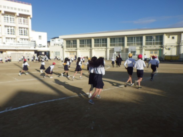 今日は先週と入れ替わって、たてわり班の青と緑チームがマラソン、赤と黄のチームがじゃんけんドンをしました。