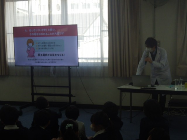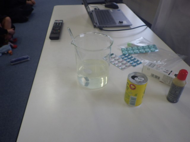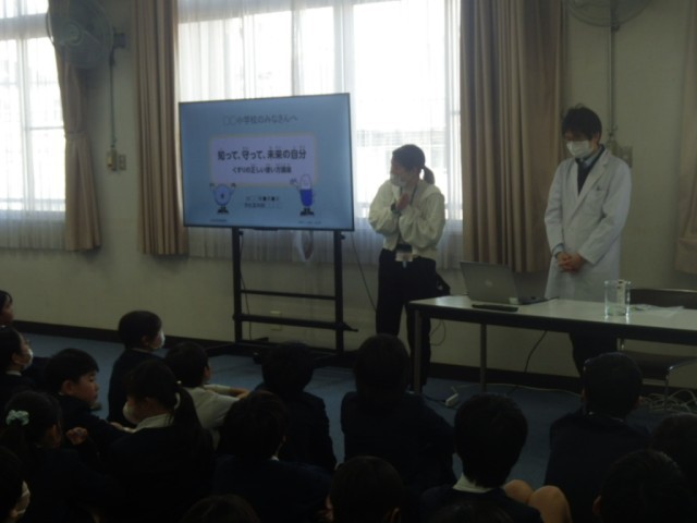 6年生が学校薬剤師の先生から「おくすり講座」として薬の種類や服用の方法、服用時間の記載の違いなどを教えていただきました。お茶やジュースで薬を飲むと効果が変わったりなくなったりしてしまうことがある様子が見てわかる実験もしていただきました。
