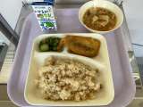 今日のメニューは、チキンカレーライス、ビーンズサラダ、アーモンドフィッシュ、牛...
