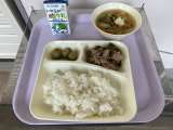 今日のメニューは、豚肉とれんこんのいため煮、五目汁、きな粉よもぎだんご、ごはん...