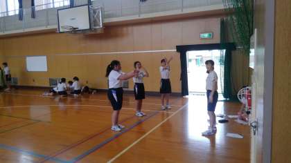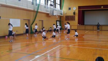 ラジオ体操テストに向けて、今日はグループ練習です。仲間の動きを細かくチェックし、改善を図っています。グループによってはタブレットの動画で動きをチェックしているグループも…。