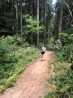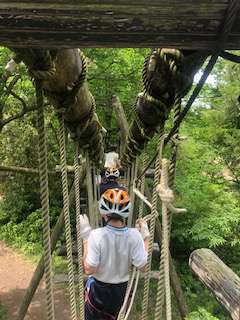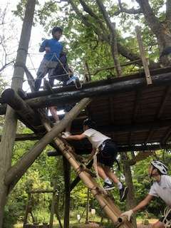 ハーネスをつけ、命綱を繋ぎながら、樹上を移動します。100mのジップラインは迫力満点です。