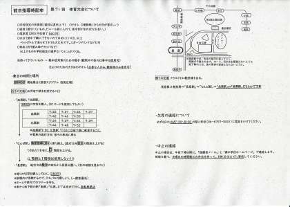 本日、事前指導で配布した交通経路についてのプリントは、HPの「配布文書」に掲示しております。