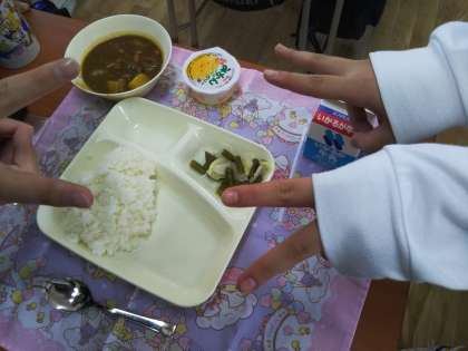 本日より給食が始まりました。本日のメニューはカレーでした。子どもたちに大人気のメニューで、ほぼ完食状態でした。