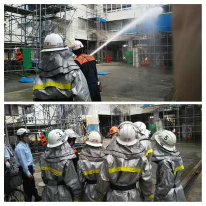 消防署での活動です。30kgのホースを肩にかけて放水訓練を行っているところです。ホース先端部の使い方によって、水を直接かけるためだけでなく周りの空気を冷やすためにも用いられることなどを教えてもらいました。