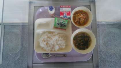 ピリ辛丼、中華スープ、ソフト黒豆、発酵乳、牛乳