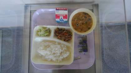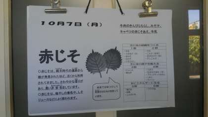 牛肉のきんぴらちらし、みそ汁、キャベツの赤じそあえ、牛乳