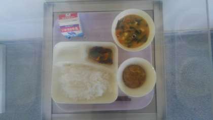和風おろしハンバーグ、みそ汁、かぼちゃのいとこ煮、ご飯、牛乳