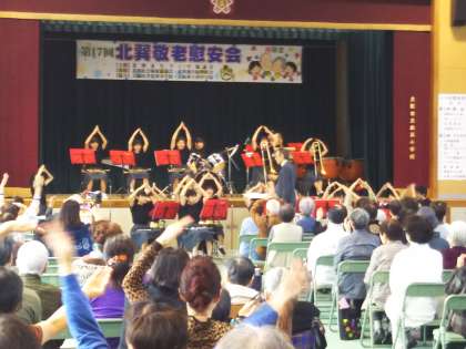 10月27日、吹奏楽部が北巽敬老慰安会に招待され、演奏を披露しました。3年生が引退して1・2年生だけでの出演でしたが、来場の皆さんの暖かい声援もあり立派に演奏することが出来ました。ありがとうございました。写真はみんなが一体となり盛り上がった『Y.M.C.A.』の演奏風景です。