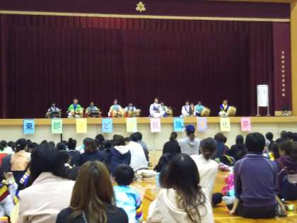 舎利寺小学校から桃谷高校までのパレードの後、体育館で各学校からの発表がありました。巽中学校のウリ文化部も合奏と合唱を行いました。