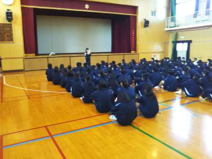 11月6日、2年生は校外学習に出発しました。兵庫県篠山市にある伝統工芸公園陶の里と三田市にある有馬富士公園で活動します。写真は出発式の様子です。