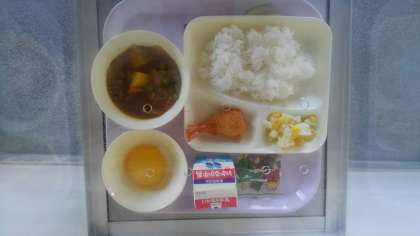 えびフライカレーライス、カリフラワーのピクルス、豆こんぶ、白桃