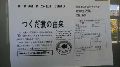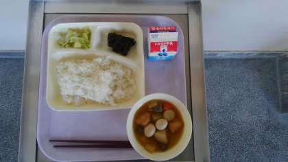 関東煮、あっさりキャベツ、のりの佃煮、ご飯、牛乳